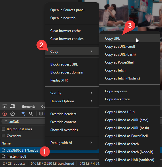 - ด้านล่างจะขึ้นชื่อไฟล์ เช่น 691dafd9d9a23.m3u8 ให้คลิกขวาที่ชื่อไฟล์ เลือก Copy > Copy URL